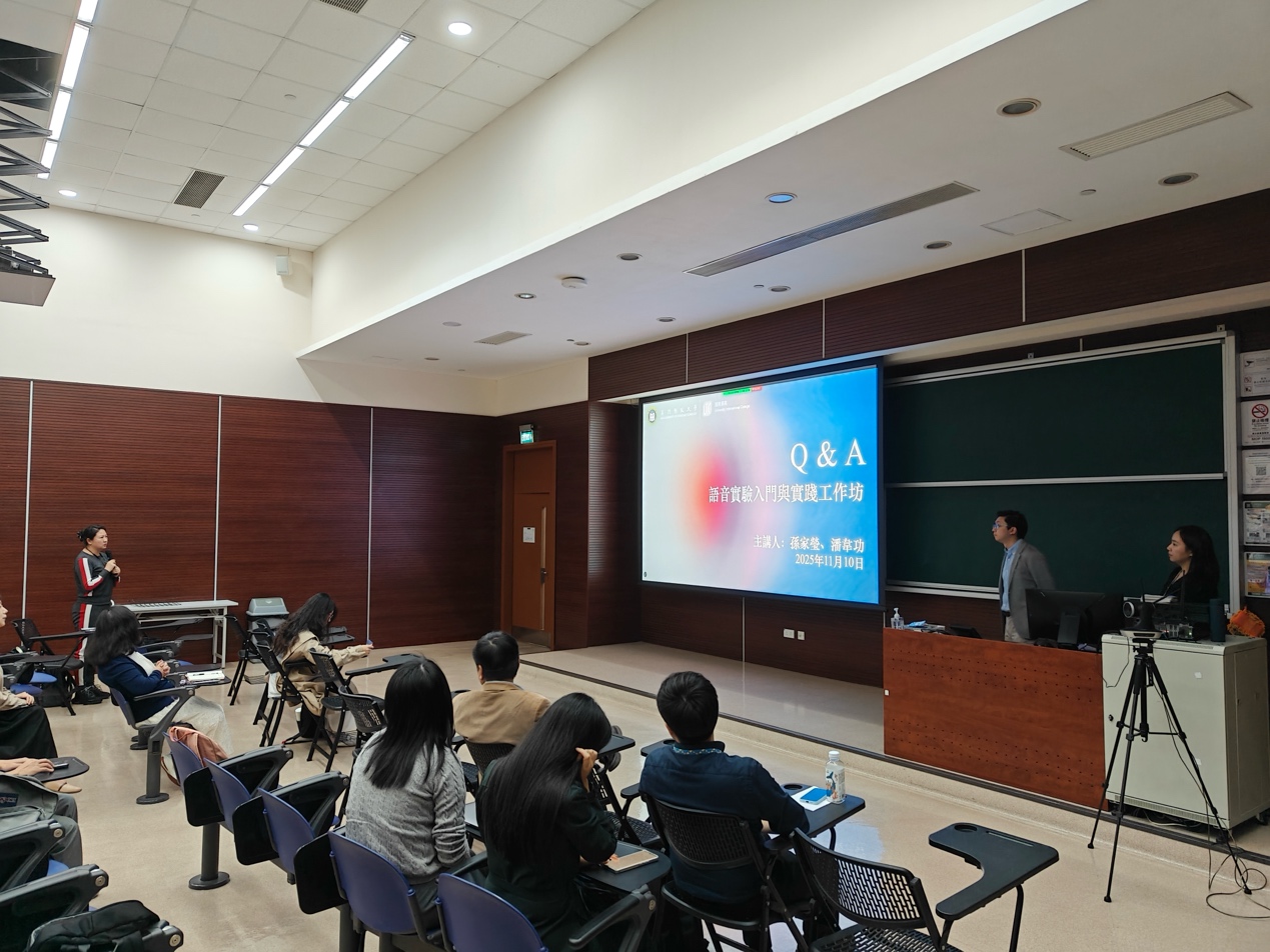 2025年11月10日晚,澳門科技大學語音實驗室於N座212舉辦2025/26學年首場工作坊,主題為「解碼人聲:語音實驗入門與實踐」。工作坊由國際學院研究生課程主任尤舒翔助理教授主持,負責語音實驗室的孫家瑩和潘韋功兩位博士生主講。國際學院院長張洪明講座教授、國際學院多位教師及六十餘名碩博士研究生出席了本次活動。