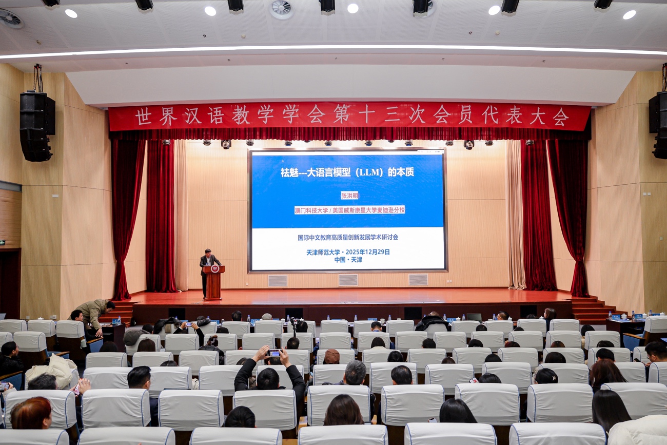 2025年12月29日,澳門科技大學國際學院院長、教育發展中心總監張洪明講座教授應邀出席“國際中文教育高質量創新發展研討會”,並發表主旨報告。此研討會是世界漢語教學學會第十三次會員代表大會的組成部分之一,在天津師範大學同步舉行。