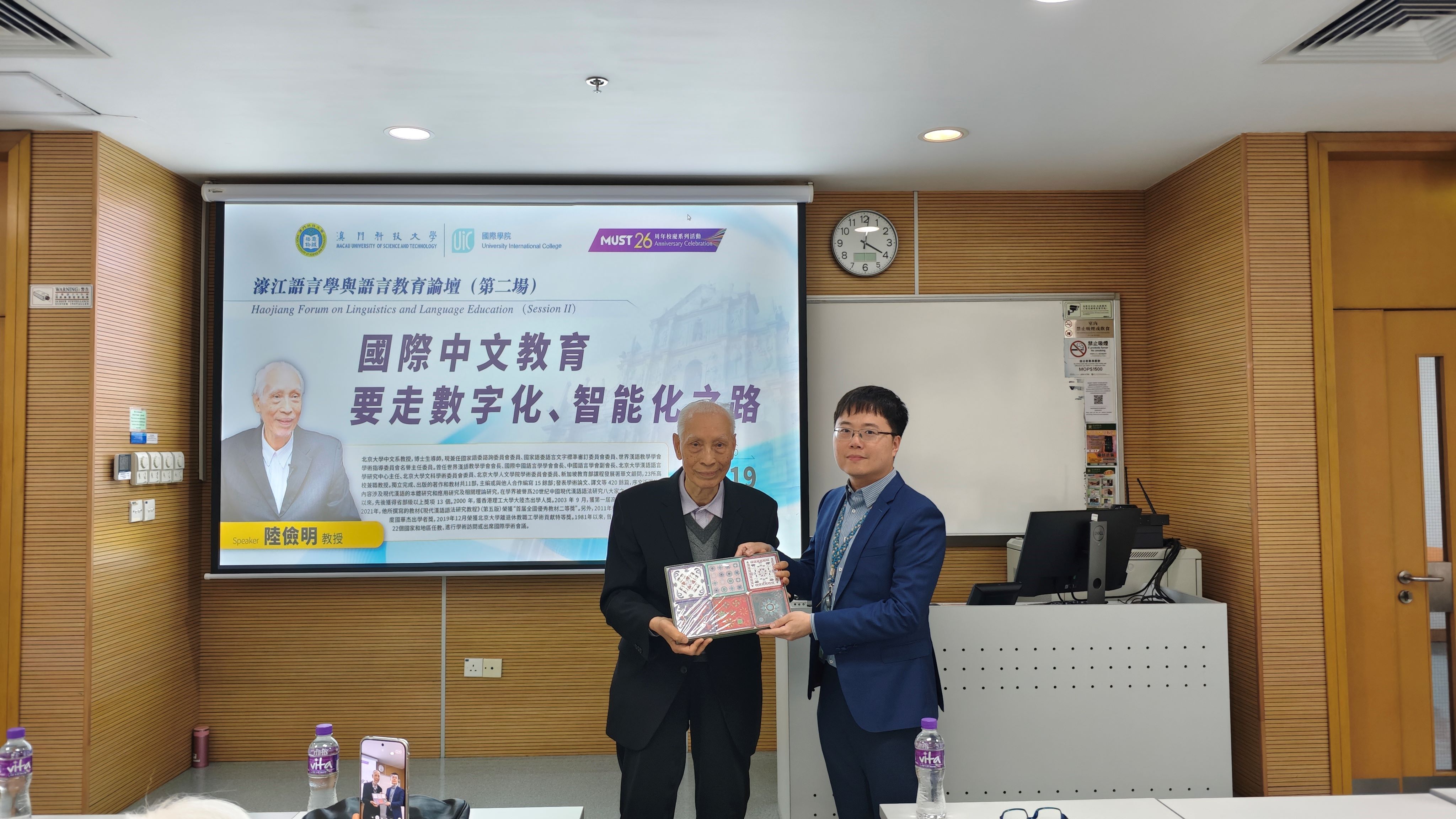 2026年3月19日下午,由澳門科技大學國際學院主辦的2026年度濠江語言學與語言教育論壇系列講座第二場於N219舉辦。正值澳科大建校26周年校慶之際,本場講座特別邀請了北京大學陸儉明教授擔任主講嘉賓,講座的題目為「國際中文教育要走數字化、智能化之路」。講座吸引了眾多師生參與,現場座無虛席。講座由國際學院研究生課程主任尤舒翔助理教授主持。講座開始前,尤舒翔課程主任代表國際學院院長、大學教育發展中心總監張洪明講座教授向陸儉明教授贈送紀念品並合影留念。
