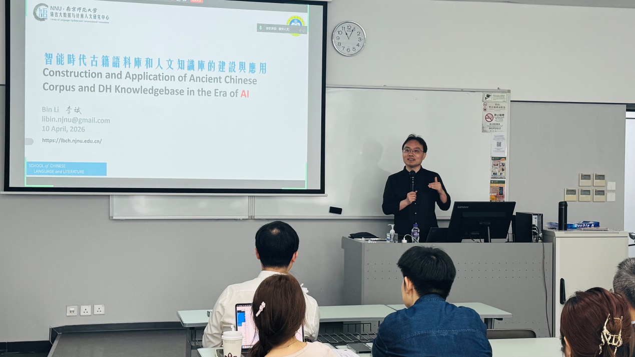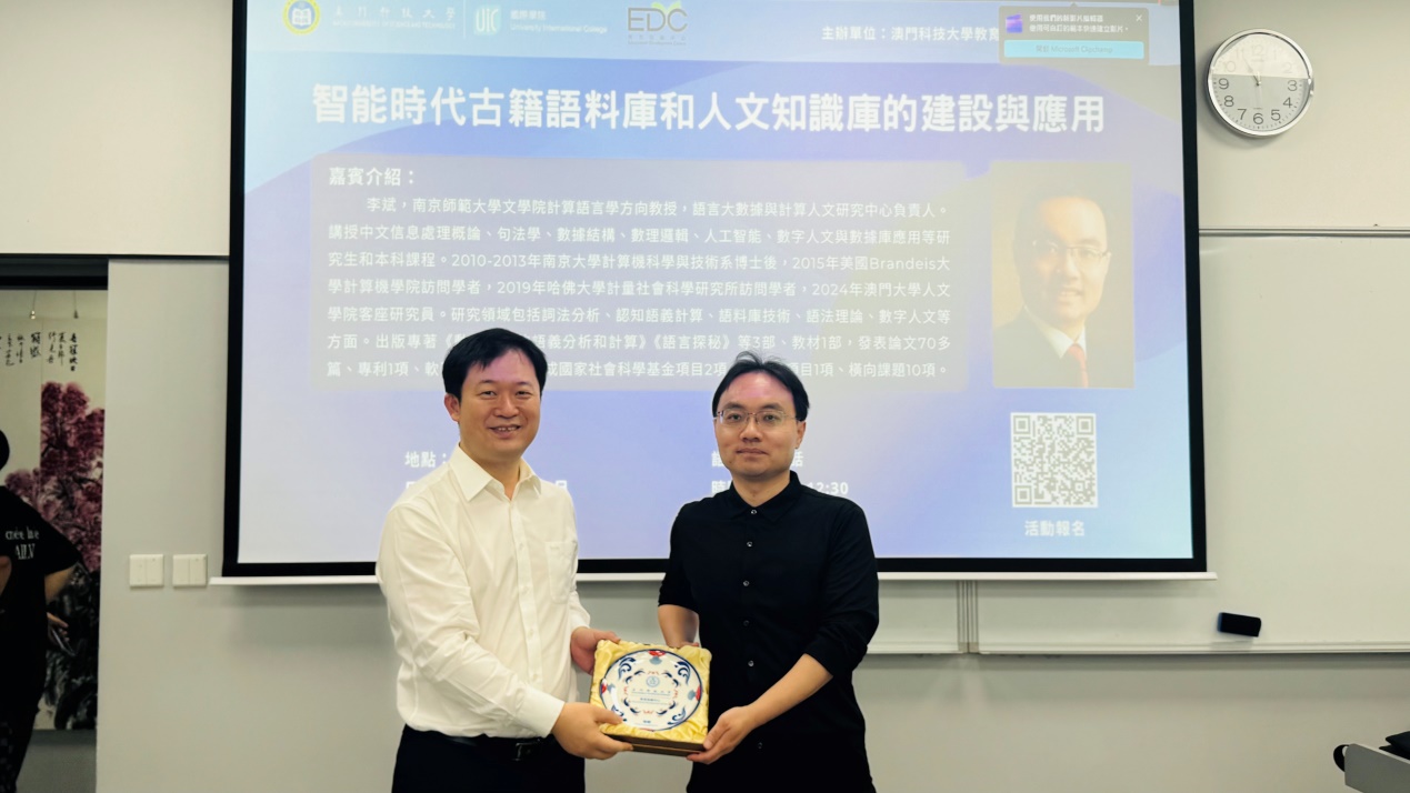澳門科技大學教育發展中心與國際學院於2026年4月10日聯合主辦「智能時代古籍語料庫和人文知識庫的建設與應用」講座。本次講座由南京師範大學文學院計算語言學方向教授、語言大數據與計算人文研究中心負責人李斌主講,由國際學院英語專業協調人胡波副教授主持,吸引了國際學院及校內眾多師生與業內專家參與,現場氣氛熱烈。