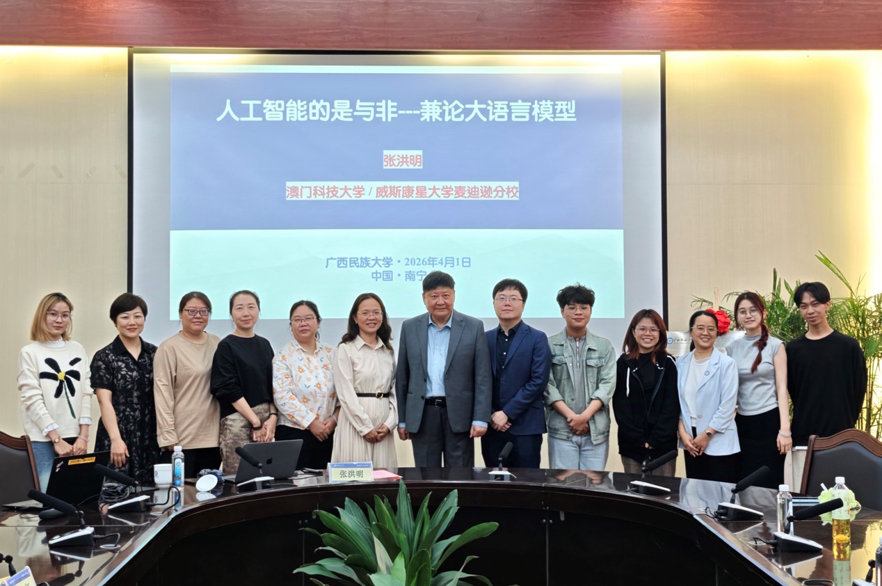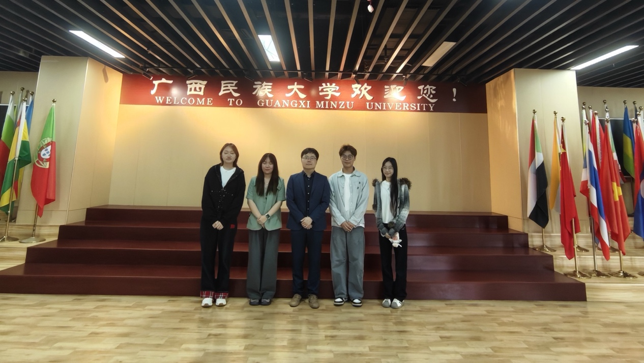 張洪明教授(中)、尤舒翔助理教授與廣西民族大學國際教育學院師生代表合影留念