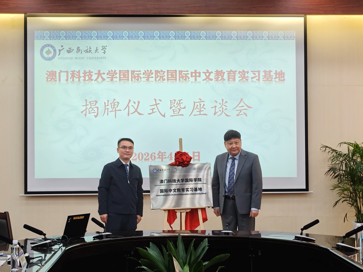 2026年3月31日至4月1日,澳門科技大學國際學院院長、教育發展中心總監張洪明講座教授與國際學院研究生課程主任尤舒翔助理教授訪問廣西民族大學。訪問期間,張洪明院長和尤舒翔助理教授參觀了該校校園環境、教學設施和國際學生文化活動中心,對在該校設立的澳門科技大學國際學院國際中文教育實習基地進行了深入考察,並與相關單位開展了一系列交流活動。