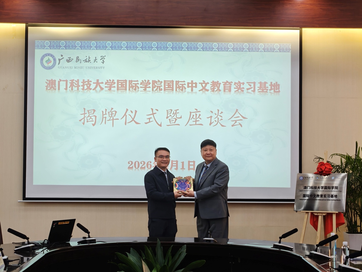 座談會後,在廣西民族大學國際交流合作處副處長、國際教育學院副院長牟永紅的主持下,張洪明院長與張宏宇書記共同為在該校設立的澳科大國際學院國際中文教育實習基地舉行了揭牌儀式。
