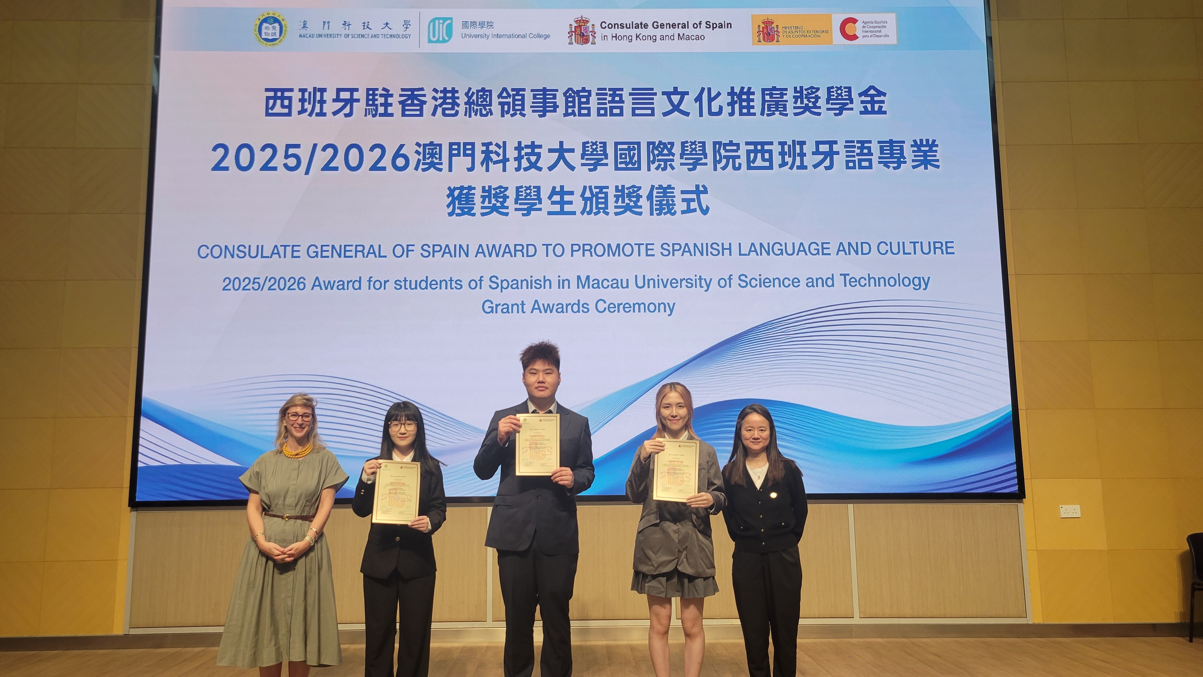 西班牙駐香港總領事館副領事María Suarez女士為西班牙語專業三名優秀學生——王劉旖旎、陳宇樂及葉雨晨——頒發「2025/2026西班牙駐香港總領事館語言文化推廣獎學金」,以表彰其在語言學習與文化推廣方面的優異表現。