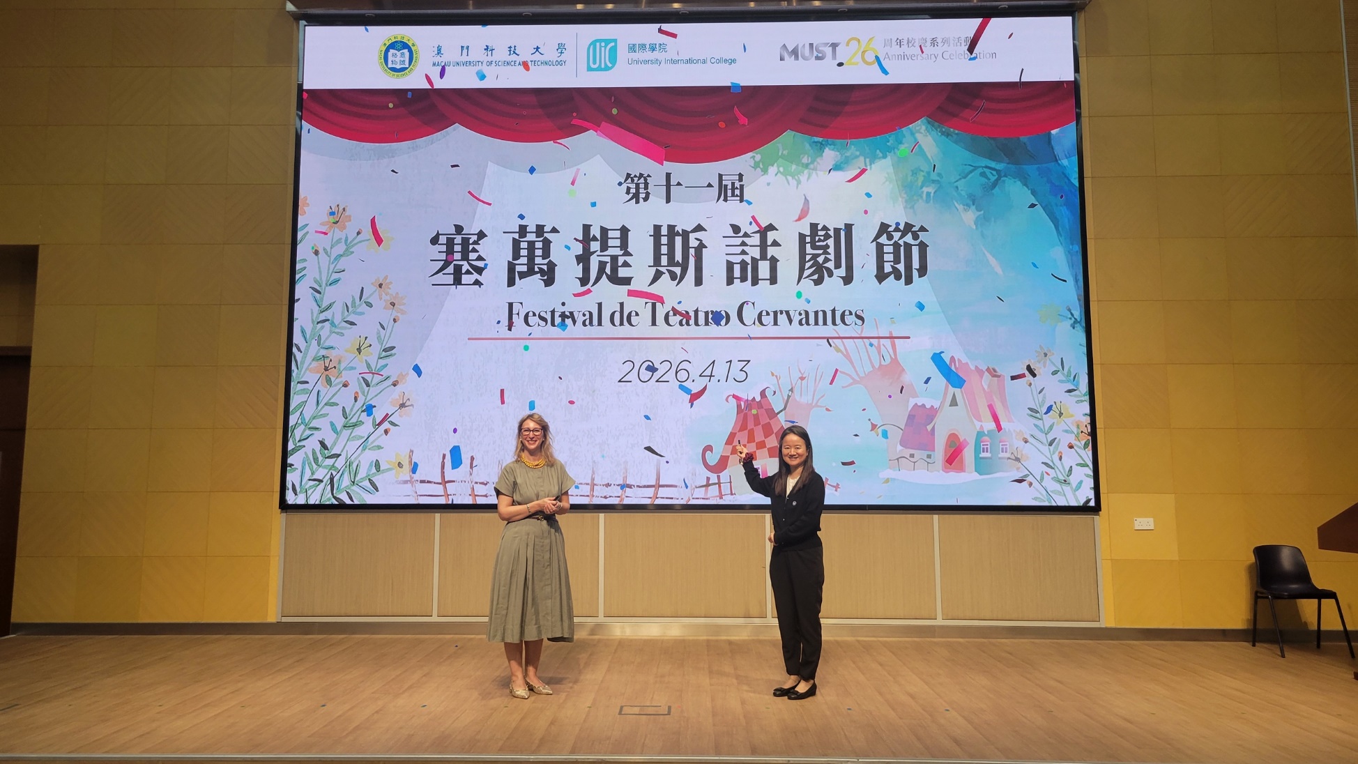 隨後,María Suarez女士與國際學院助理院長王婷副教授共同為第十一屆塞萬提斯戲劇節揭幕,標誌著本屆戲劇節正式啟動。